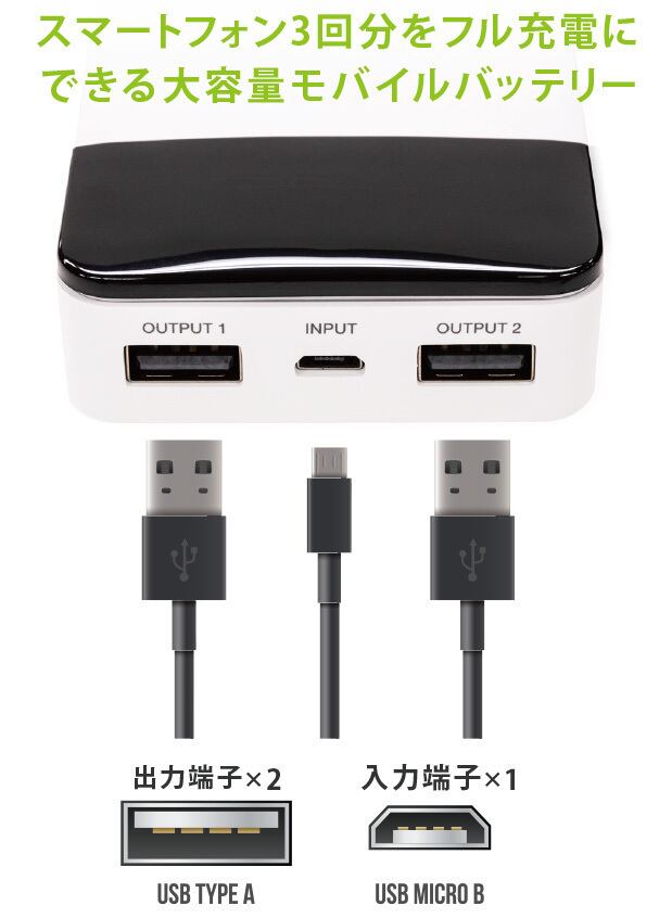USB-A出力×2/Micro USB入力×1を搭載し、2台同時充電が可能。