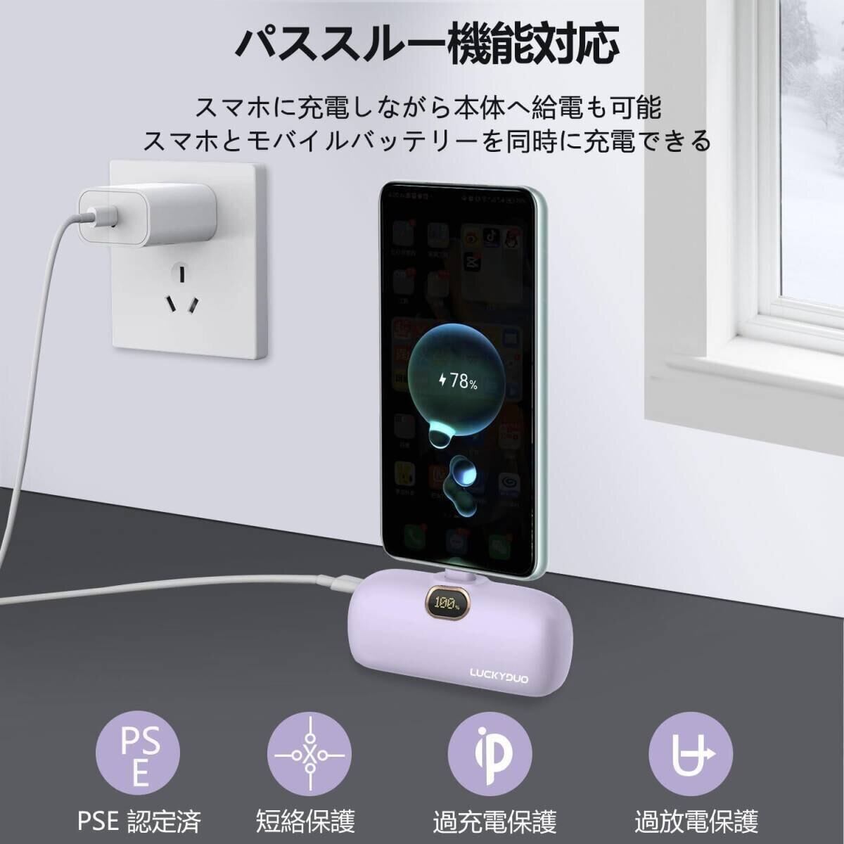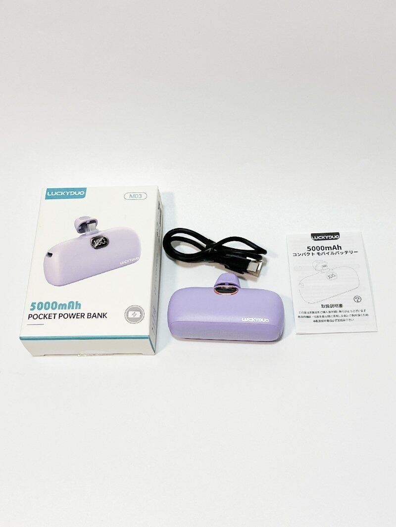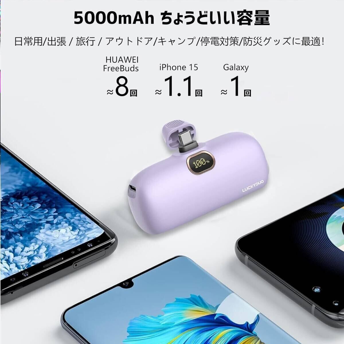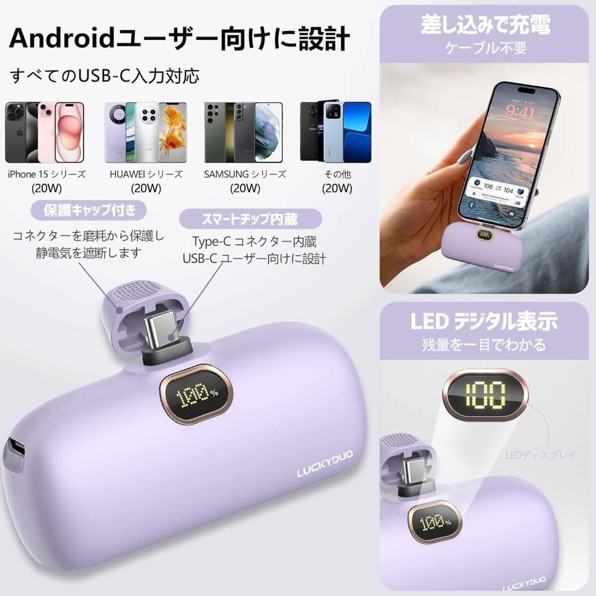 モバイルバッテリー 5000mAh コードレス 直接充電 PD20W急速充電 LCD残量表示 LEDライト付 Android iPhone Xperia Galaxy