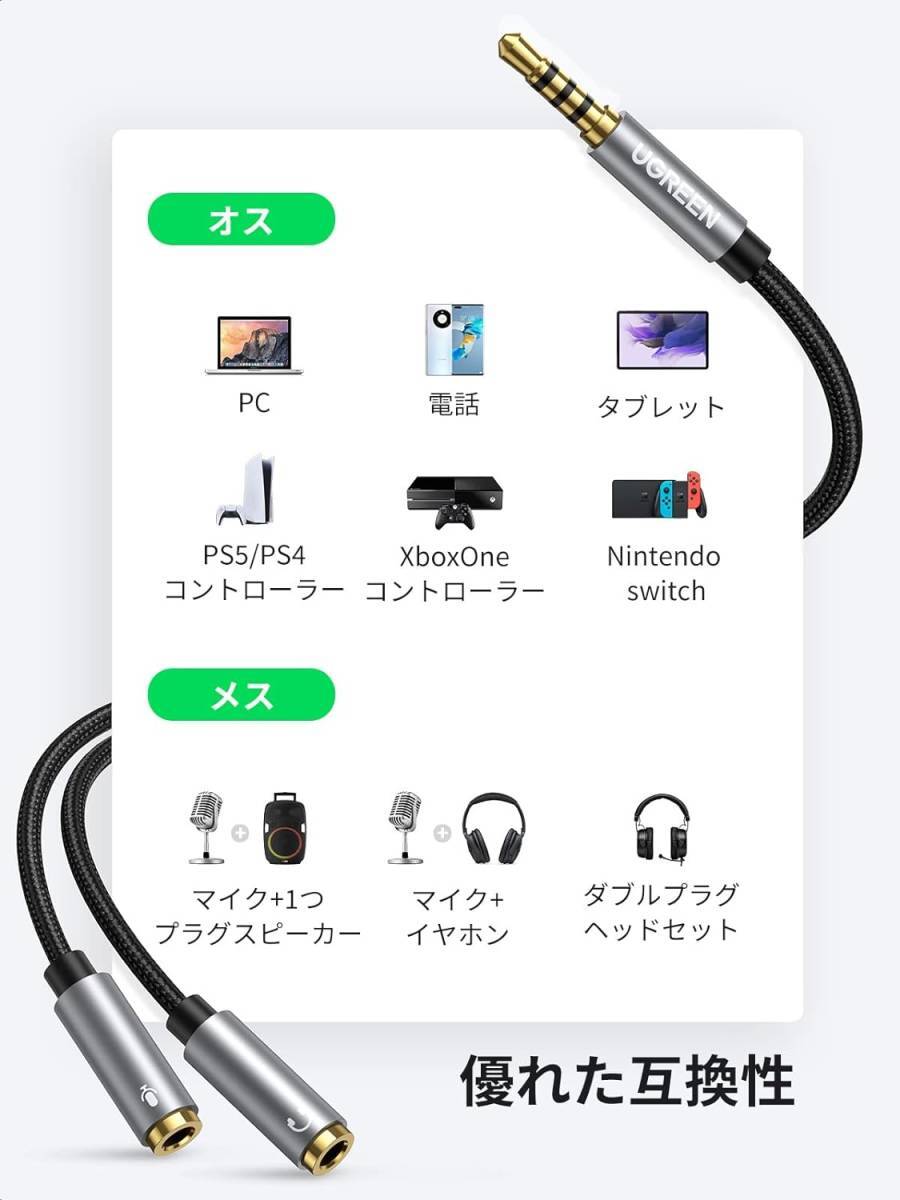 3.5mm オーディオケーブル 変換ケーブル 4極/TRRS 3極 3.5mm 分配ケーブル タブレット/MP3/PC/PS4/Xbox one 20CM