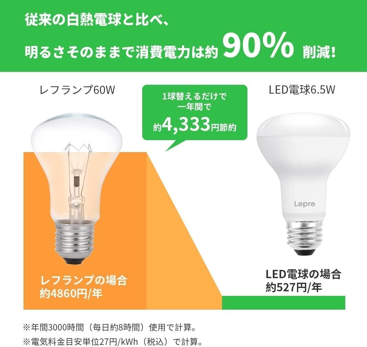 Lepro LED電球 2個入り E26口金 60W形相当 6.5W 電球色 650lm 広配光タイプ 高演色性 密閉器具対応 省エネ キッチン